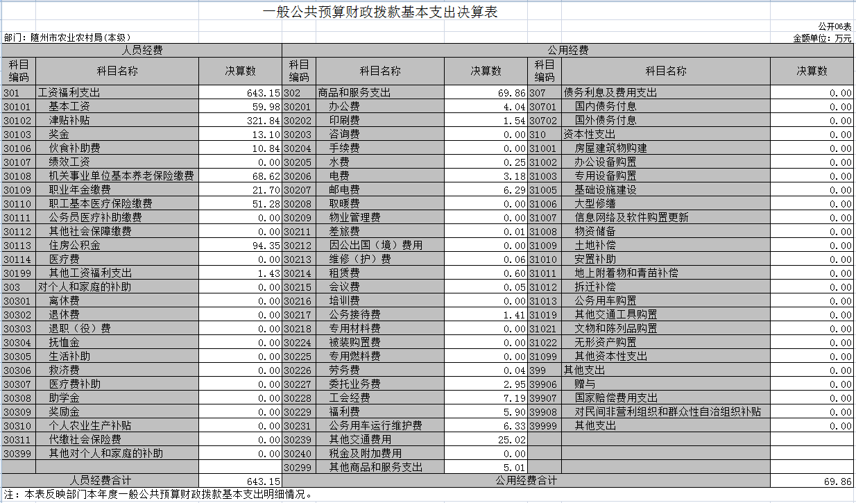 隨州市農業農村局(本級)2020機關運行經費支出69.86萬元,比年初預算75.31萬元減少5.45萬元,減少了7.24%,主要原因是:單位嚴格落實中央八項規定,控制經費支出。比2019年67.02萬元增加2.84萬元,增加了4.24%,主要原因是:2020年增加了郵電費、工會經費等公用支出。其中辦公費4.04萬元,印刷費1.54萬元,水費0.25萬元,電費3.18萬元,郵電費6.29萬元,差旅費0.01萬元,維修費0.06萬元,租賃費0.60萬元,會議費0.05萬元,公務接待費1.41萬元,勞務費0.04萬元,委托業務費2.95萬元,工會經費7.19萬元,福利費5.90萬元,公務用車運行維護費6.33萬元,其他交通費25.02萬元,其他商品服務費5.01萬元。
