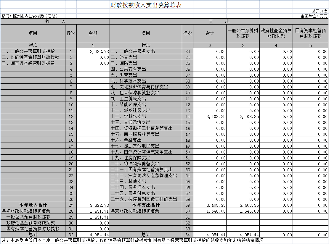 隨州市農業農村局(匯總)2020年無國有資本經營預算財政撥款收入和支出,故國有資本經營預算財政撥款支出決算表(公開09表)無數據。