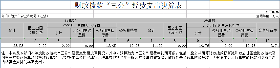 ????隨州市農業農村局(匯總)2020年度?“三公”經費支出決算數為14.50萬元,比年初預算28.58萬元減少14.08萬元,減少49.27%,主要原因是:20年加強了公務接待的控制及公車的使用管理。其中:(1)2020年初預算因公出國(境)費用0萬元,因今年沒有因公出國(境)的計劃;(2)2020年初預算公務接待費用15.53萬元,2020年度實際支出3.74萬元,減少11.79萬元,減少75.92%。全年公務接待累計接待約77批次,接待人數約520人次。(3)2020年初預算公務用車運行維護費用為13.05萬元,2020年度實際支出為10.76萬元,減少2.29萬元,減少17.55%。