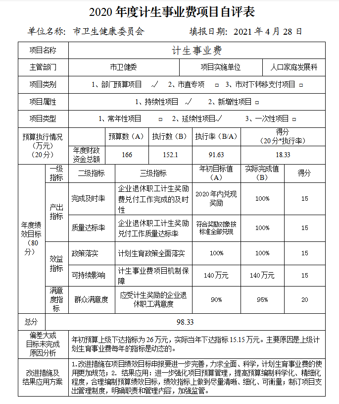 一是計劃生育事業費(常年性項目)。2020年度計生事業費預算情況:預算專項資金166萬元,來源主要是當年財政預算撥款140萬元,中央和省級轉移支付26萬元。項目實施內容為計劃生育事業的利益導向、公共服務、能力建設和管理運行的經費。通過抓項目實施推進計生事業目標實現。2020年度計生事業費資金使用情況。項目支出總額166萬元,項目資金執行率為100%。本績效評價經財政局委托第三方項目績效評價等級為做優,評價分100分。詳細績效自評見附表。