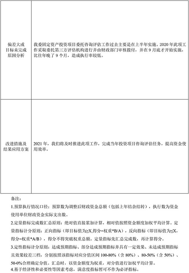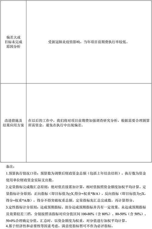 針對2020年績效自評中存在的主要問題。一是部分項目支出預算前,要加強調查研究分析,尤其是較大的支出、結余資金要分析原因,根據需要合理預測所需資金,避免在執行中出現偏差。二是加強預算執行過程中的監管、日常調度和督導,推動各個項目工作,提高工作質量和項目資金的使用效率、效益。