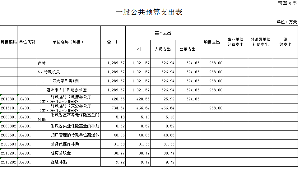 市政府辦公室2016年支出預算總額為1289.57萬元,其中,基本支出1021.57萬元,項目支出268萬元。
