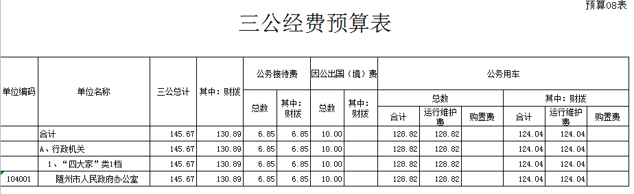 2016年市政府辦公室“三公”經費預算145.67萬元。其中:因公出國(境)費10萬元,公務接待費6.85萬元,公務用車費128.82萬元(其中:公務用車運行維護費128.82萬元,無公務用車購置費預算)。