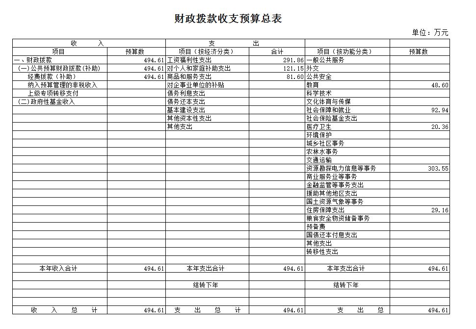 2016年收入預算總額為494.61萬元,其中,經費撥款494.61萬元;支出預算總額為494.61萬元,其中,住房保障支出29.16萬元,教育支出48.60萬元,社會保障和就業支出92.94萬元,醫療衛生支出20.36萬元,資源勘探電力信息等事務支出303.55萬元。
