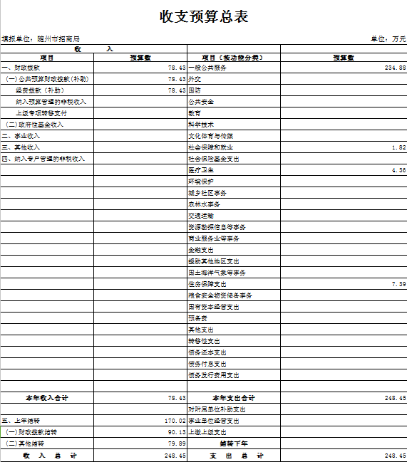 招商局2017年部門收入預算248.45萬元,其中:財政撥款收入78.43萬元,上年結轉170.02萬元。收入較上年減少10.84萬元,同比下降4.4%,主要是因為人員調動,人員支出減少。