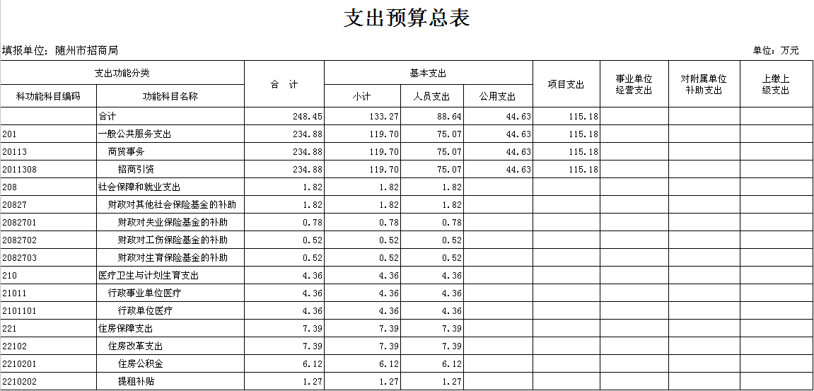 招商局2017年部門支出預算248.45萬元,其中:基本支出133.27萬元,項目支出115.18萬元。按支出功能分,一般公共服務支出234.88萬元,社會保障和就業支出1.82萬元,醫療衛生與計劃生育支出4.36萬元,住房保障支出7.39萬元。支出較上年減少10.84萬元,同比下降4.4%,主要是因為人員調動,人員支出減少,招商活動減少。