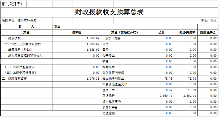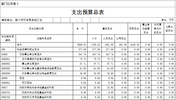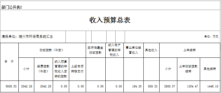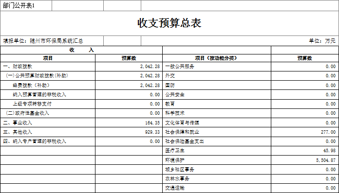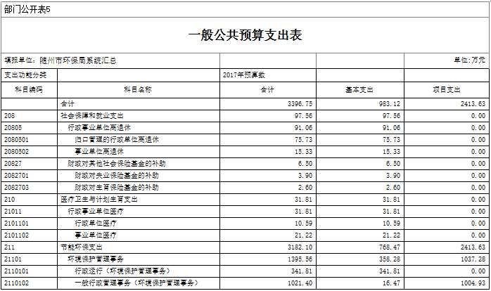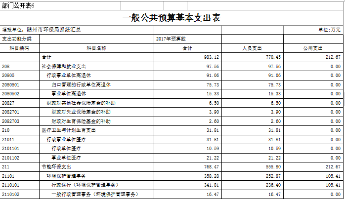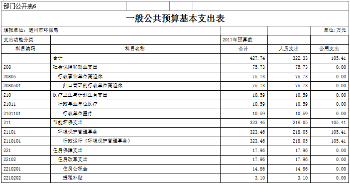 2017年環保局系統納入部門預算管理單位6個,市環保局、市環保局曾都分局、市環境監察支隊、市環境保護監測站、市環保局高新園區分局、市機動車排氣污染監督管理中心。本級單位人員編制18人,實有人員18人,離退休人數12人。