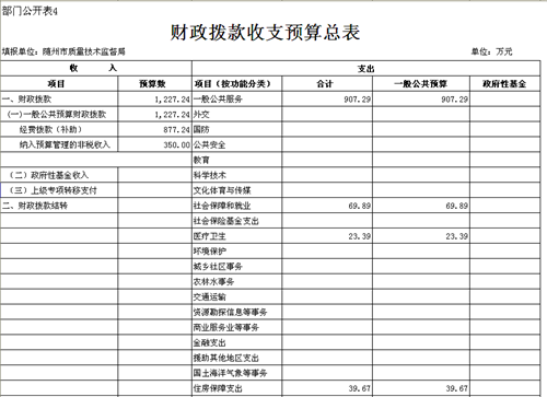 隨州市質監局部門預算由市局機關、下設的3個直屬副處級單位,即市局稽查分局、市局行政許可分局、市局城區分局和3個正科級直屬事業單位,即隨州市產品質量監督檢驗所、隨州市信息和標準化所、隨州市行政許可技術審查中心共7個單位組成。市本級單位數量較上年減少隨州市計量檢定測試所1個單位,以下數據均不含該單位。