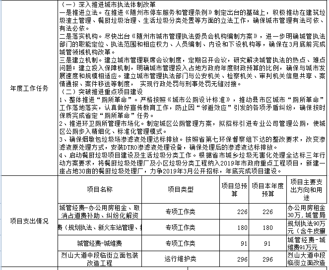 2018年本級(jí)財(cái)政支出2670.36萬(wàn)元,其中基本支出200.10萬(wàn)元,增加了3.42萬(wàn)元,較上年增加2%,主要用于人員工資、公用經(jīng)費(fèi)和社會(huì)保障繳費(fèi)的支出,是由于工資及社會(huì)保障繳費(fèi)上調(diào);對(duì)附屬單位補(bǔ)助支出260.25萬(wàn)元,較上年減少5%,主要是經(jīng)費(fèi)不足;項(xiàng)目支出2210.01萬(wàn)元,較上年增加1022.78萬(wàn)元,主要用于數(shù)字城管建設(shè)及城區(qū)旱廁改造等延續(xù)性工程,項(xiàng)目支出占支出總額的82%,前期工程已經(jīng)完成,等待驗(yàn)收付款。