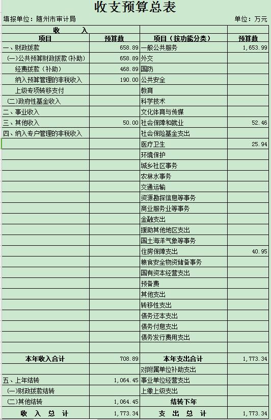 隨州市審計局由市審計局機關、市經濟責任審計局和市投資審計局三部門組成,局機關內設辦公室、政工人事科、綜合科、法規科、社會保障審計科、固定資產投資審計科、金融經貿審計科、行政事業審計科、財政外資審計科、農業與資源環保審計科、計算機電子數據審計科。截至2017年12月31日,人員編制40人,其中:行政編制33人、事業編制3人、工勤編制(以錢養事)4人;實有人數35人(行政人員31人、以錢養事4人),退休9人。
