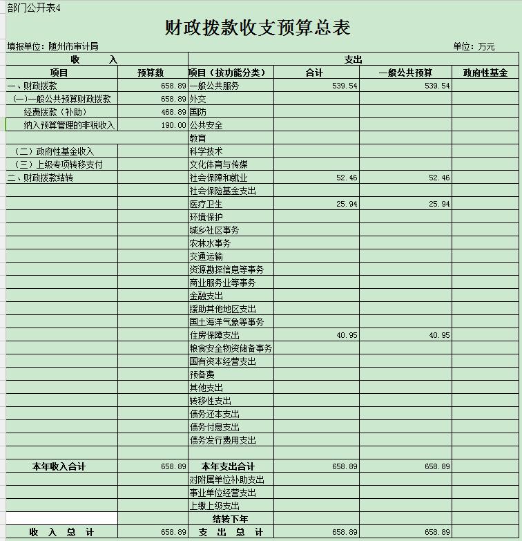 2018年市審計局財政撥款收入預算總計658.89萬元,其中:經費撥款(補助)468.89萬元、納入預算管理的非稅收入190萬元。財政撥款支出預算總計658.89萬元,支出按經濟分類分工資福利性支出351.03萬元、對個人和家庭補助支出14.99萬元、商品和服務支出242.87萬元、其他資本性支出50萬元;按功能分類分一般公共服務539.54萬元、社會保障和就業52.46萬元、醫療衛生25.94萬元、住房保障支出40.95萬元。較上年財政撥款支出預算安排減少273.53萬元,減少比例29.34%,減少的主要原因:一是離退休人員工資由社保部門統一發放,部門預算中不再預算離退休人員工資;二是2018年預算中未編制獎勵工資。