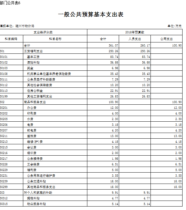 2018年物價局一般公共預算公用支出總計100.9萬元。其中,辦公費12萬元;印刷費4萬元;水費2.3萬元;電費3.18萬元;郵電費4.2萬元;差旅費13萬元;因公出國費用0萬元;維修費4.18萬元;會議費3萬元;培訓費2萬元;公務接待費用1.98萬元;工會經費6.51萬元;福利費5萬元;公務用車運行維護費3.55萬元;公務交通補貼18萬元;其他商品和服務支出18萬元。較上年的104.47減少3.57萬,同比減3.54%。減少原因是壓縮開展,減少不合理的經費支出。