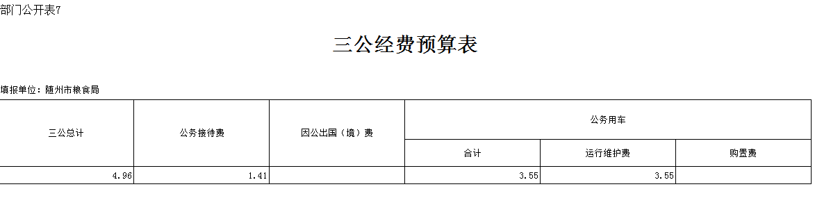 3.公務用車情況。糧食部門(隨州市糧食局)核定公車編制1臺,實有1臺。2018公務用車運行維護費3.55萬元,與上年基本持平。財政撥款公務用車購置費0萬元,與上年一樣。