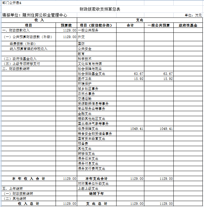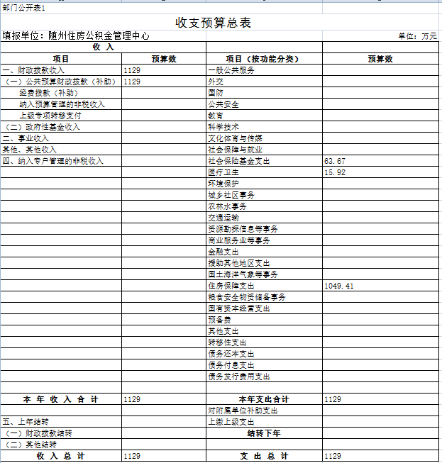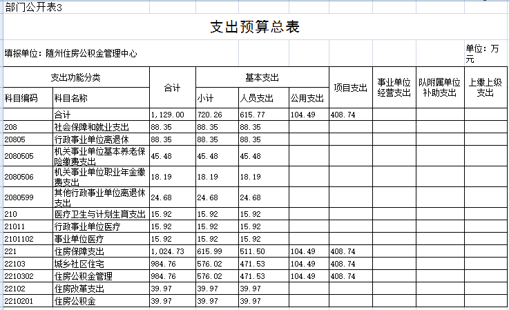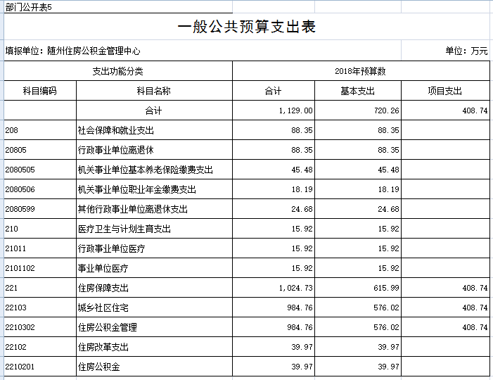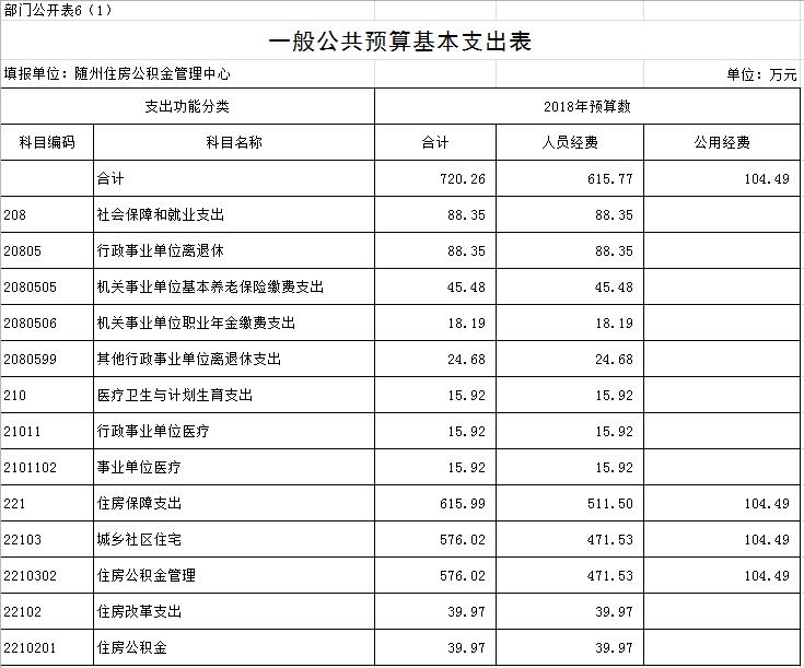 第一部分 隨州住房公積金管理中心概況 一、主要職能 二、基本情況 三、2018年主要工作任務及目標 第二部分 隨州住房公積金管理中心2018部門預算情況 一、2018部門預算收支情況說明 (一)部門收入預算情況 (二)部門支出預算情況 (三)財政撥款支出情況 (四)政府性基金情況 (五)國有資本經營預算情況 (六)機關運行經費支出情況 (七)政府采購情況 二、2018年“三公”經費預算情況說明 第三部分 隨州住房公積金管理中心2018年部門預算表 一、收支預算總表 二、部門收入總表 三、部門支出總表 四、財政撥款收支總表 五、一般公共預算支出表 六、一般公共預算基本支出表 七、一般公共預算“三公”經費支出表 八、政府性基金預算支出表 第四部分 名詞解釋 第一部分 隨州住房公積金管理中心概況 一、主要職能 1、負責編制、執行全市住房公積金的歸集、使用計劃; 2、負責記載職工住房公積金的繳存、提取、使用等情況; 3、負責住房公積金的核算; 4、負責審批住房公積金的提取、使用; 5、負責住房公積金的保值和歸還; 6、負責編制住房公積金歸集、使用計劃執行情況的報告; 7、負責編制、公布住房公積金年度報告; 8、負責擬訂增值收益分配方案并組織實施; 9、承辦市住房公積金管理委員會決定的其他事項。 二、基本情況 隨州住房公積金管理中心為隨州市人民政府不以營利為目的的公益二類正處級事業單位,內設綜合科、財務會計科、歸集執法科、貸款管理科、內審稽核科、信息管理科等6個科室,1個營業部及廣水、隨縣2個辦事處。從業人員39人,其中,在編22人,聘用人員17人。 三、2018年主要工作任務及目標 2018年全年工作目標:力爭實現凈增實繳人數5000人,歸集公積金8億元,發放公積金個人住房貸款6億元,實現增值收益3500萬元,保持全省住房公積金管理先進單位。 第二部分 隨州住房公積金管理中心2018部門預算情況 一、2018部門預算收支情況說明 (一)部門收入預算情況 2018年財政收入1129萬元,全部是財政補助撥款,比上年減少28.72萬元,減少2.48%,主要原因是綜合服務平臺建設費用較上年信息系統建設費用減少。 (二)部門支出預算情況 2018年部門支出預算安排1129萬元,其中:一般公共服務支出104.49萬元,社會保障和就業支出88.35萬元,醫療衛生支出15.92萬元,住房保障支出511.50萬元。比上年減少28.72萬元,減少2.48%,主要原因是綜合服務平臺建設費用較上年信息系統建設費用減少。 (三)財政撥款支出情況 2018年財政撥款支出1129萬元,其中:一般公共服務支出104.49萬元,社會保障和就業支出88.35萬元,醫療衛生支出15.92萬元,住房保障支出511.50萬元。比上年減少28.72萬元,減少2.48%,主要原因是綜合服務平臺建設費用較上年信息系統建設費用減少。 (四)政府性基金情況 2018年本部門無政府性基金收支預算。 (五)國有資本經營預算情況 沒有使用國有資本經營預算撥款安排的支出。 (六)機關運行經費支出情況 2018年,中心機關運行經費預算103萬元,明細如下:辦公費2.00萬元,水電費30.00萬元,物業管理費25萬元,郵電費1.71萬元,維修(護)費2.02萬元,差旅費10.50萬元,工行會費10.72萬元,福利費13.40萬元,公務用車費7.65萬元、為公務用車運行維護費。2018年機關運行經費比2017年預算62.37萬元增加40.63萬元、增長65.14%,預算增加的主要原因是中心本部及廣水、隨縣辦事處業務大廳的水電費和物業管理費列入機關運行經費,兩項共增加預算52.59萬元。 (七)政府采購情況 2018年中心納入政府采購預算資金114萬元,明細如下:綜合服務平臺建設74萬元,網絡設備、計算機及外設購置費40萬元,主要原因是綜合服務平臺建設費用較上年信息系統建設費用減少。 二、2018年“三公”經費預算情況說明 2018年中心“三公”經費預算安排9.14萬元,比2017年預算數11.53萬元減少2.39萬元,減少20.73%,減少的主要原因是壓縮公務用車費用。“三公”經費預算中,因公出國(境)費用0萬元,同比上年0萬元增加0萬元;公務接待費1.49萬元,比上年1.33萬元增加0.16萬元,增加12.03%,增加的主要原因是隨著住房公積金業務規模的快速增加,各管理中心在提高綜合服務水平和信息化建設等方面加強了經驗交流,接待人次會有所增加;公務用車費7.65萬元,比上年10.20萬元減少2.55萬元,減少25%,減少的原因是節約開支、停用了老舊車輛。其中:公務用車購置費0萬元,比上年0萬元增加0萬元。公務用車運行費7.65萬元,比上年10.20萬元減少2.55萬元,減少25%,減少的原因是節約開支、停用了老舊車輛。 第三部分 隨州住房公積金管理中心2018年部門預算表 一、收支預算總表 二、部門收入總表 三、部門支出總表 四、財政撥款收支總表 五、一般公共預算支出表 六、一般公共預算基本支出表