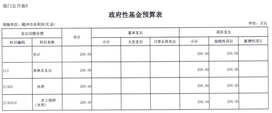 2018年水利局系統(tǒng)匯總政府性基金收入200萬元,支出200萬元。水利局本級部門無政府性基金收入。