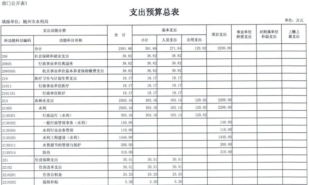 水利局本級部門支出2591.66萬元,其中社會保障與就業(yè)支出38.82萬元,醫(yī)療衛(wèi)生支出19.17萬元,農(nóng)林水事務(wù)支出,2503.16萬元,住房保障支出30.51萬元。支出與上年相比增加了247.18萬元,增長率為10.54 %。主要原因:一是2018年增加全面推行河長制項(xiàng)目;二是增加防汛抗旱信息化建設(shè)項(xiàng)目;三是隨州市鄂北水資源配置工程建設(shè)指揮部辦公室項(xiàng)目經(jīng)費(fèi)支出納入水利局年度預(yù)算。