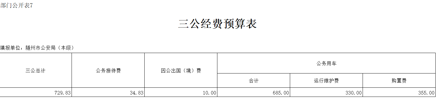 隨州市公安局本級預算“三公經費”729.83萬元,比上年減少52.5萬元,減少6.71%,其中: