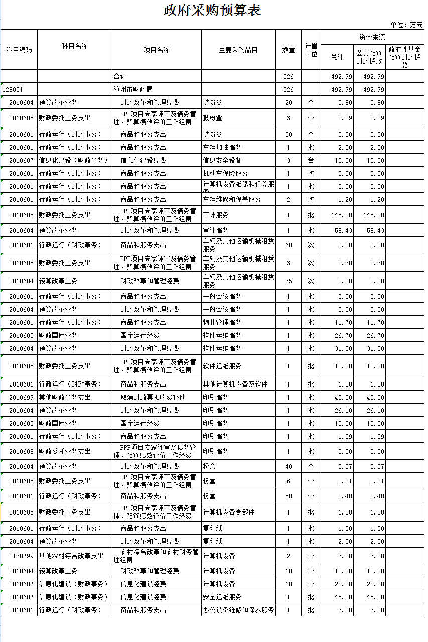 2020年市財(cái)政局政府采購(gòu)預(yù)算總額496.99萬(wàn)元,其中:政府采購(gòu)貨物預(yù)算50.47萬(wàn)元、服務(wù)預(yù)算442.52萬(wàn)元,較上年政府采購(gòu)預(yù)算總額410萬(wàn)元增加86.99萬(wàn)元,增幅21.22%,主要原因:一是要將部分電子產(chǎn)品更新為國(guó)產(chǎn)化設(shè)備;二是財(cái)政票據(jù)改版,印刷費(fèi)用增加。