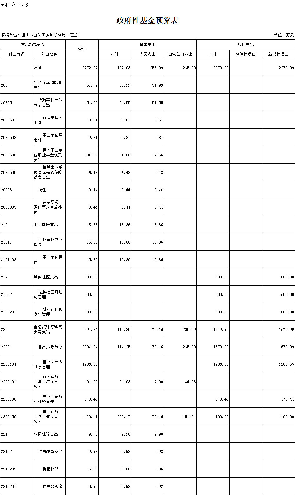 隨州市自然資源和規劃局2020年度系統匯總政府性基金預算合計2772.07萬元,其中:基本支出492.08萬元,項目支出2279.99萬元。隨州市自然資源和規劃局為2019年4月新組建單位,納入部門預算管理的單位共18個,無上年對比數據。