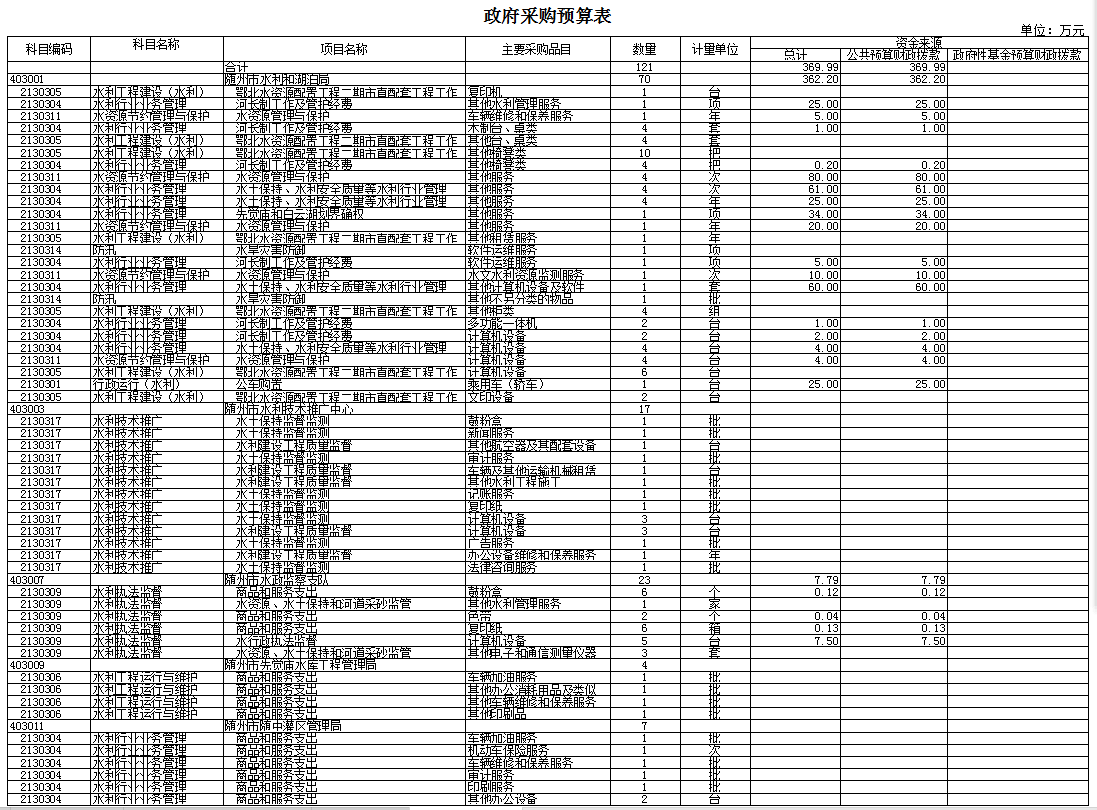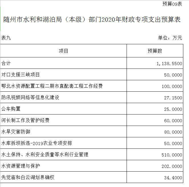 2020年納入部門預(yù)算管理單位8個(gè),隨州市水利和湖泊局(本級(jí))、水政監(jiān)察支隊(duì)、水利技術(shù)推廣中心、河道堤防建設(shè)管理局、先覺廟水庫工程管理局、白云湖水利工程管理局、隨中灌區(qū)管理局、市移民局。