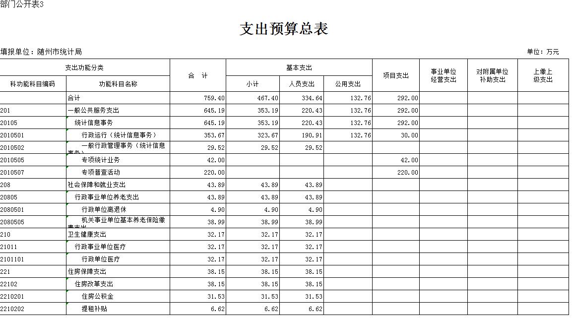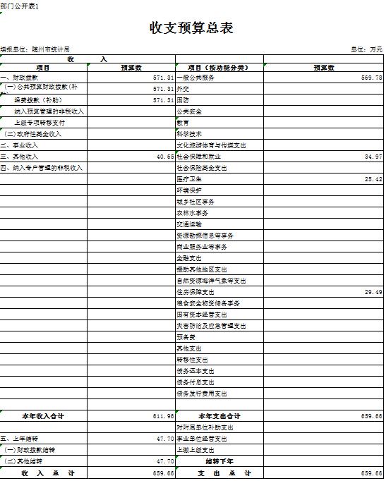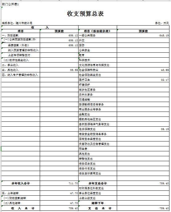 隨州市統(tǒng)計(jì)局(匯總)2020年收支總預(yù)算759.4萬元;隨州市統(tǒng)計(jì)局(本級)2020年收支總預(yù)算659.66萬元;