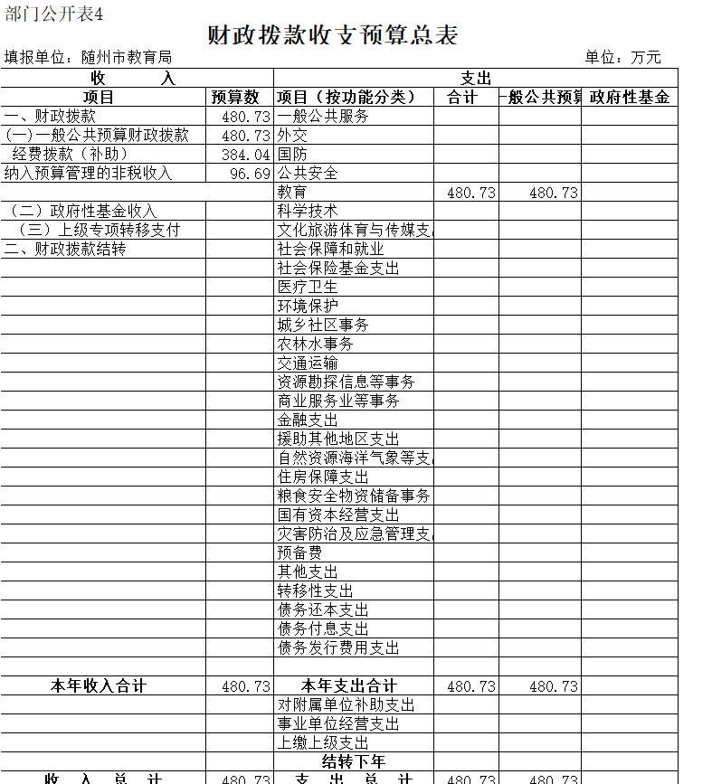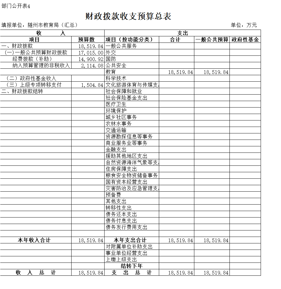 四、財政撥款收支預算總表