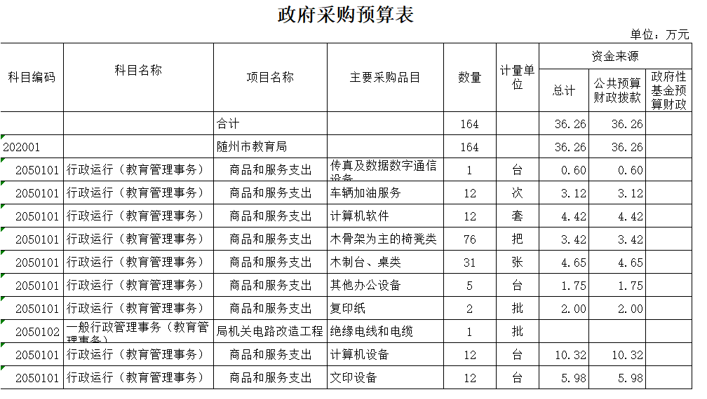 2020年,本級局機關政府采購預算36.26萬元,比上年23.62萬相比增加了12.64萬元,增加了53.51%,主要原因是2020年預算了局機關水電、辦公桌椅及更換局機關計算機設備。