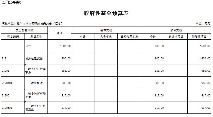 2020年度委系統政府性基金1603萬元,比上年增加1106萬元,增加222.54%,增加原因是機構改革單位合并,項目增加。