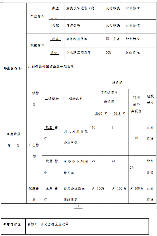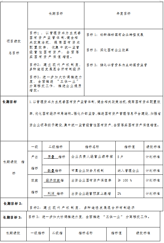 一、部門整體績效目標編制情況2020年市國資委部門整體績效目標是根據部門主要職責編制,制定細化明確的預算績效目標和可考核、可量化的績效指標,并加強對績效目標的審核,將其作為預算編制和資金安排的前置條件和重要依據。加強對支出效果和資金使用績效的監控,將預算績效評價結果作為預算安排的重要依據。