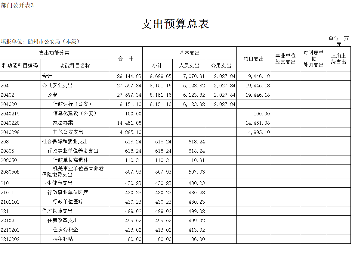 2020年隨州市公安局本級預算公共安全支出27597.34萬元,比上年增加8620.9萬元,增加45.43%,主要是項目支出增加;社會保障和就業支出618.24萬元,比上年減少68.69萬元,減少10%;醫療衛生支出430.23萬元,比上年增加46.15萬元,增加12.02%;住房保障支出499.02萬元,比上年增加34.96萬元,增加7.53%。根據人社部門批復的工資表計算。