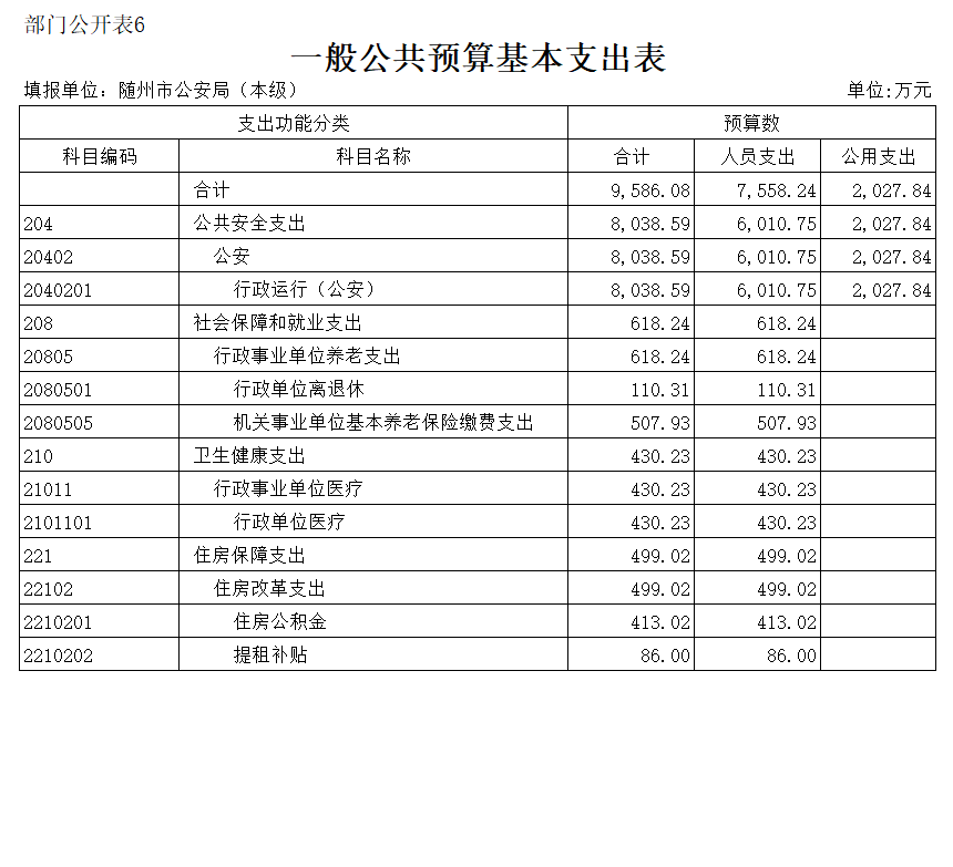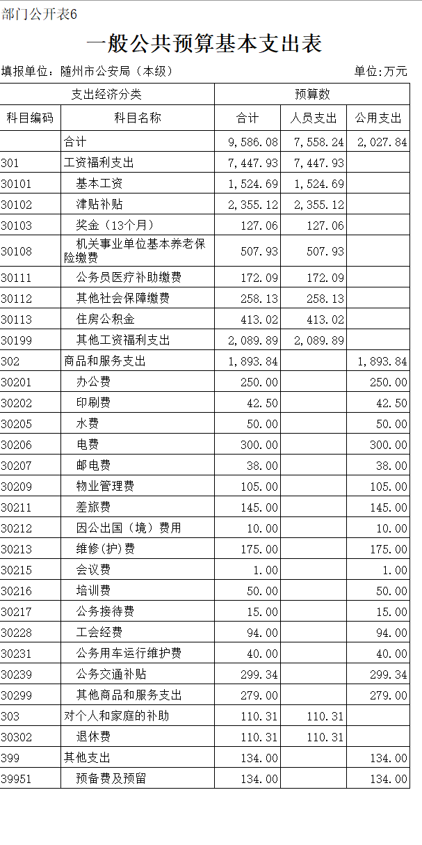 隨州市公安局本級財政撥款基本支出9586.08萬元,比上年增加411.85萬元,增加4.49%。