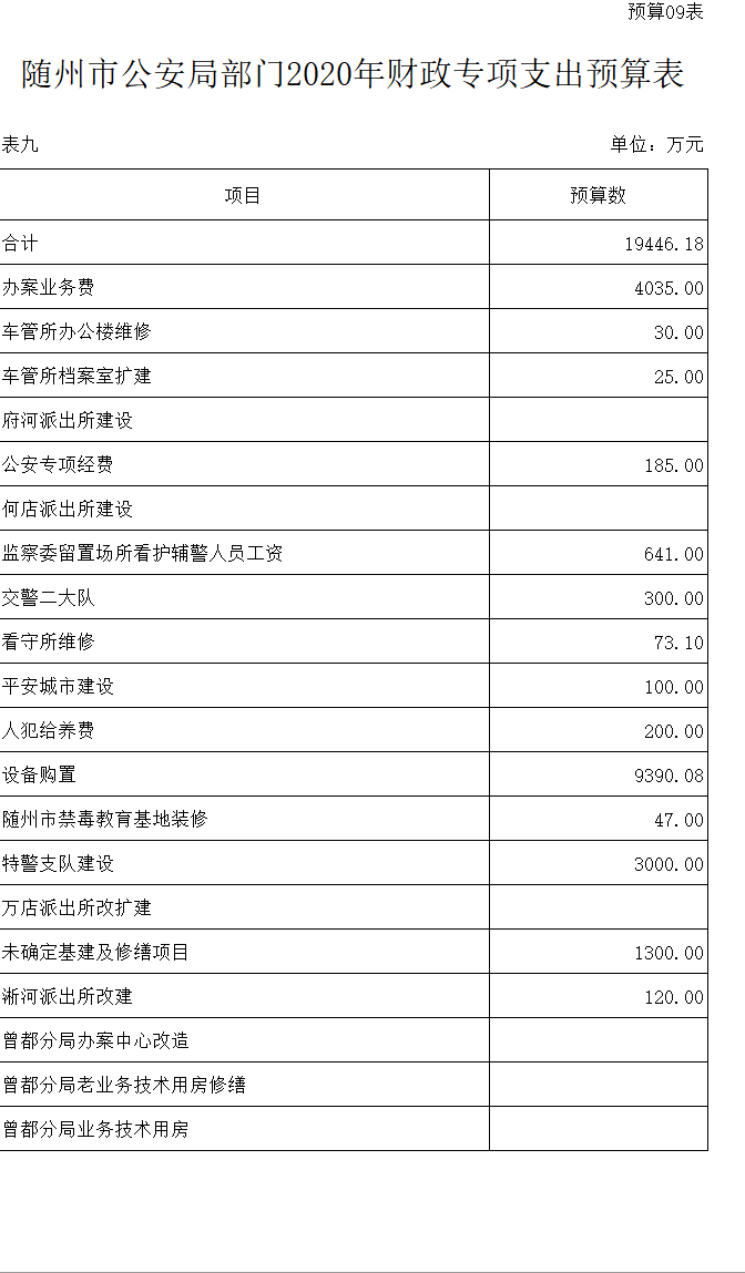 2020年隨州市公安局本級預算19446.18萬元,比上年度增加8165.18萬元,增加72.38%,根據實際需要安排。