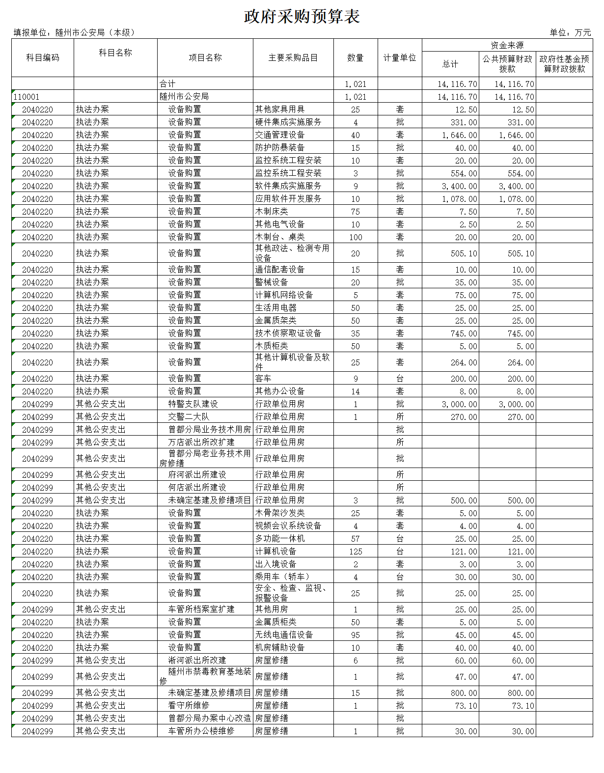 隨州市公安局本級政府采購預算支出14807.7萬元,比上年增加6627.7萬元,增加81.02%。采購貨物類991件套,支出9311.6萬元,比上年增加3482萬元,增加167.57%;采購工程類30批次,支出4805.1萬元,比上年增加1005.1萬元,增加26.45%;采購服務類16批次,支出691萬元,比上年減少209萬元,減少23.22%。根據實際需要安排。