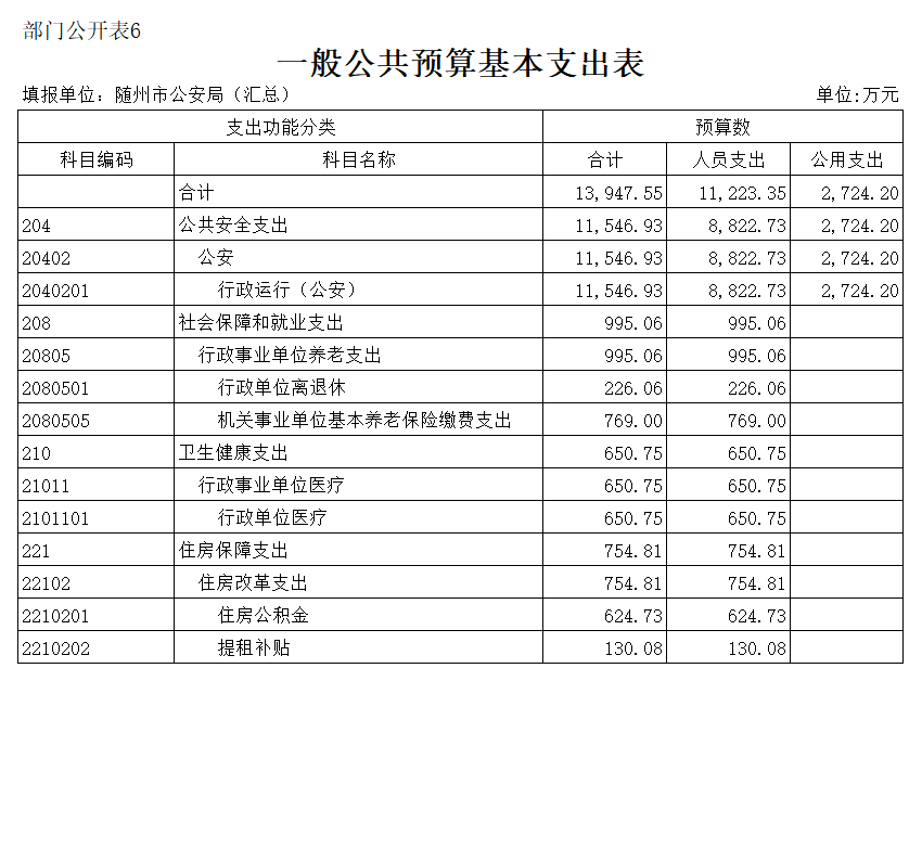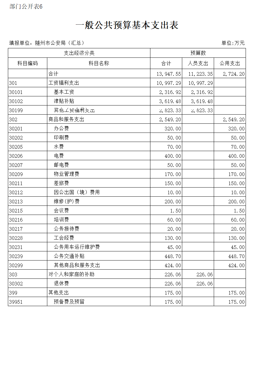 2、隨州市公安局匯總財政撥款基本支出13947.55萬元,比上年增加439.98萬元,增加3.26%。原因見分項說明。