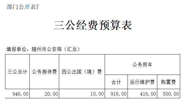 2020年隨州市公安局匯總“三公”經費年初預算安排946萬元,比上年增加51萬元,同比增加5.7%,主要是公務用車購置費增加。