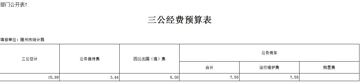 2019年隨州市統計局“三公”經費年初預算安排15.99萬元,比上年30.94減少14.95萬元,同比減少48.32%,主要原因是:減少了公務用車購置經費。其中: