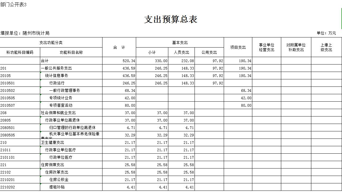 2019年預算支出總額520.34萬元。其中統計信息事務行政運行246.25萬元、一般行政管理事務68.34萬元、專項統計業務42萬元、專項普查活動80萬元、歸口管理的行政單位離退休4.71萬元、機關事業單位基本養老保險繳費支出32.29萬元、行政單位醫療21.17萬元、住房公積金21.17萬元、提租補貼4.41萬元。與2018年預算支出總額526.35萬元減少了6.01萬元,增加1.14%,主要原因是減少了隨州市第三次全國農業普查項目收入。