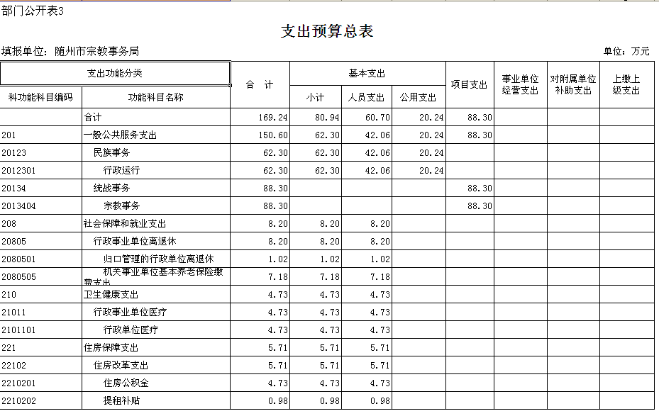 2210202 一般公共服務(wù)(類)住房改革支出(款)提租補貼支出(項):指市民宗局用于對機(jī)關(guān)個人和家庭的補助支出。