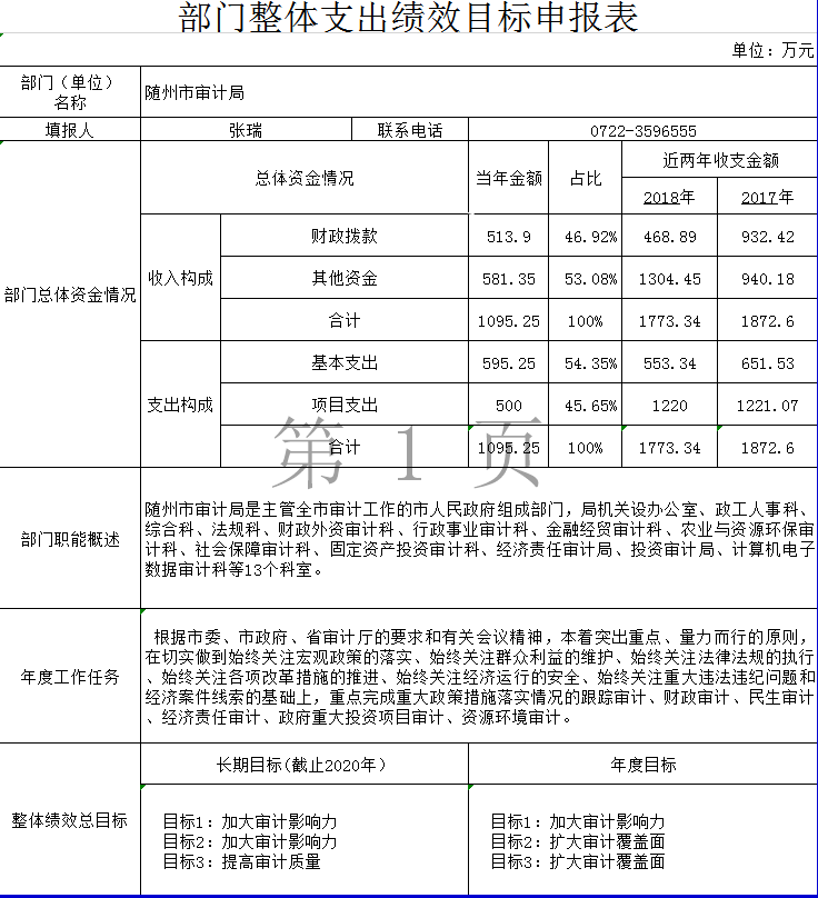 隨州市審計(jì)局由市審計(jì)局機(jī)關(guān)、市經(jīng)濟(jì)責(zé)任審計(jì)局和市投資審計(jì)局三部門組成,局機(jī)關(guān)內(nèi)設(shè)辦公室、政工人事科、綜合科、法規(guī)科、社會保障審計(jì)科、固定資產(chǎn)投資審計(jì)科、金融經(jīng)貿(mào)審計(jì)科、行政事業(yè)審計(jì)科、財(cái)政外資審計(jì)科、農(nóng)業(yè)與資源環(huán)保審計(jì)科、計(jì)算機(jī)電子數(shù)據(jù)審計(jì)科。截至2018年12月31日,人員編制41人,其中:行政編制33人、事業(yè)編制3人、工勤編制(含:以錢養(yǎng)事)5人;實(shí)有人數(shù)38人(行政人員33人、工勤編制5人)。