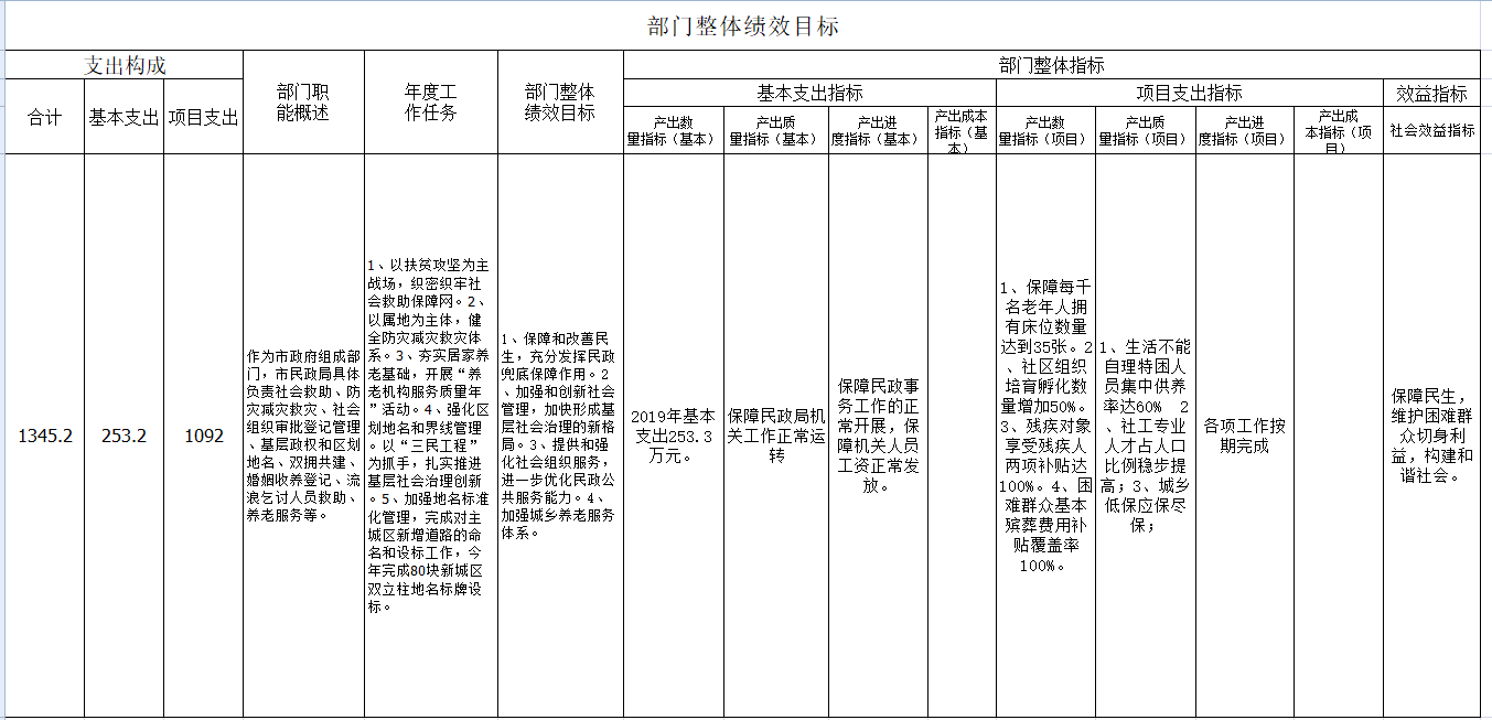 按照財(cái)政部門對(duì)推進(jìn)預(yù)算績(jī)效管理工作的總體部署,將2019年度預(yù)算整體績(jī)效目標(biāo)公開。民政局部門整體支出預(yù)算1345.2萬(wàn)元,其中基本支出253.2萬(wàn)元、項(xiàng)目支出1092萬(wàn)元,主要用于保障機(jī)關(guān)運(yùn)轉(zhuǎn)及開展養(yǎng)老、社會(huì)救助、社會(huì)福利、區(qū)劃地名、社會(huì)組織、社工人才等工作。