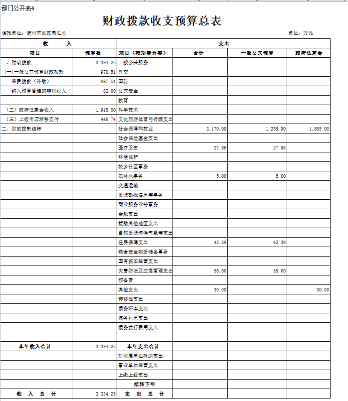2019年,隨州市民政局系統(tǒng)財(cái)政撥款預(yù)算支出合計(jì)3334.25萬(wàn)元,比上年支出減少353.48萬(wàn)元,同比減少9.6%,主要原因?yàn)椴糠志謱賳挝粔嚎s項(xiàng)目開支。