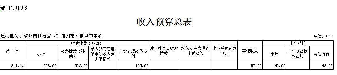 2019年糧食部門預算收入總額847.12萬元,比去年824.09萬元增加23.03萬元,同比增加2.79%,增加主要原因是軍糧供應中心其他收入增加。