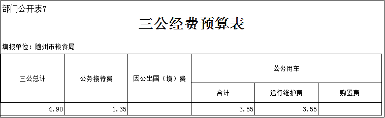3、公務用車情況。糧食部門(隨州市糧食局)核定公車編制1臺,實有1臺。2019公務用車運行維護費3.55萬元,與上年一樣。財政撥款公務用車購置費0萬元,與上年一樣。