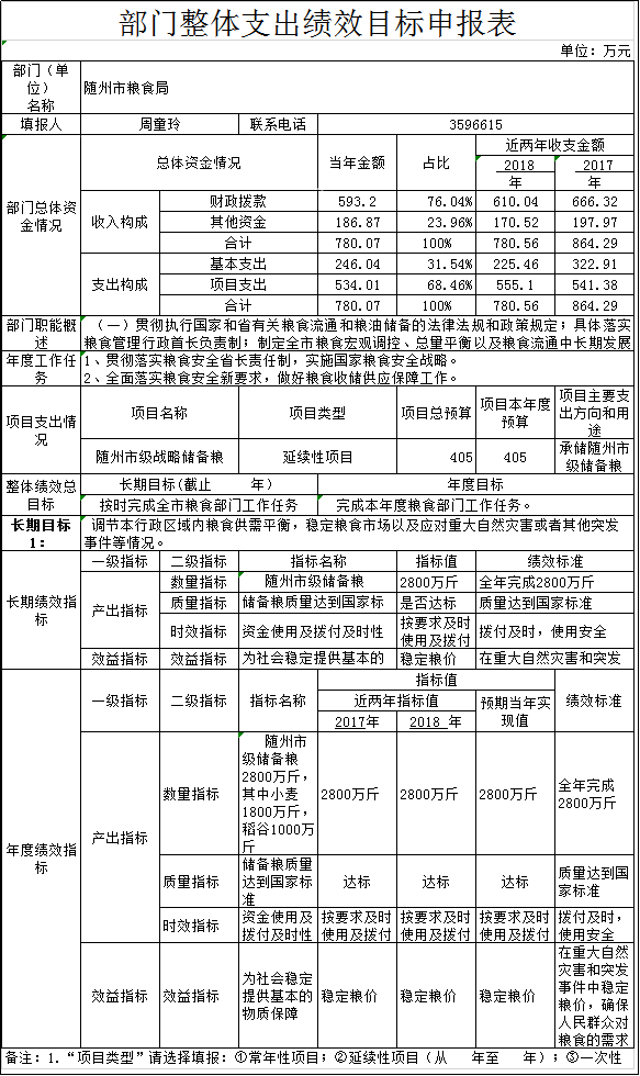 ?隨州市糧食局為市政府工作部門,負責全市糧食流通宏觀調控、社會糧食流通管理和全市糧食行業管理。內設6個科(室),即辦公室、調控科、監督檢查科、財務審計科、倉儲科、產業發展科。人員編制數15人(行政編制14人、工勤編制1人),2018年年末實有在職人員14人、退休人員9人,車輛編制數1輛,實有車輛1輛。列入2019年財政預算管理的局屬公益一類事業單位1個:隨州市軍糧供應中心。人員編制數5人,實有人員3人。