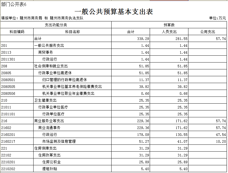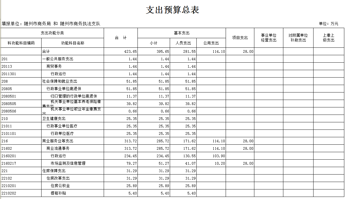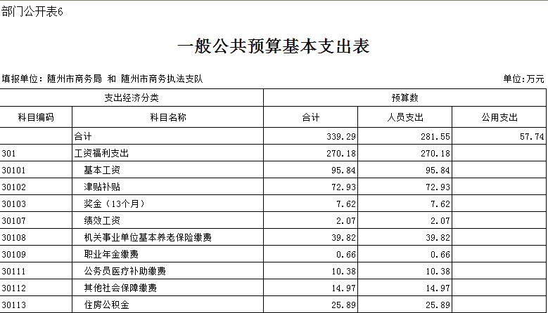 2019年商務(wù)系統(tǒng)支出預(yù)算總額423.65萬元。按支出功能科目劃分:一般公共服務(wù)支出1.44萬元,占支出預(yù)算總額的0.34%;社會(huì)保障和就業(yè)支出51.85萬元,占支出預(yù)算總額的12.24%;醫(yī)療衛(wèi)生支出25.35萬元,占支出預(yù)算總額的5.98%;商業(yè)服務(wù)業(yè)等事務(wù)支出313.72萬元,占支出預(yù)算總額的74.05%;住房保障支出31.29萬元,占支出預(yù)算總額的7.39%。比上年度預(yù)算支出總額(337.48萬元)增加46.17萬元,增加12.23%增加的主要原因?yàn)樯虅?wù)執(zhí)法支隊(duì)成立,人員進(jìn)一步完善,人員支出和日常運(yùn)行費(fèi)用增加。