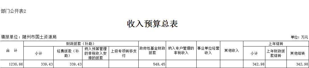 隨州市國土資源局本級2019年度收入預算合計1230.86萬元,其中公共預算財政撥款(補助)339.43萬元,政府性基金收入548.45萬元,其他結轉342.98萬元。比上年度預算收入總額1253.88增加23.02萬元,增加比例1.87%,主要原因是增加了隨州市曾都、隨縣、廣水地質災害詳細調查項目收入。