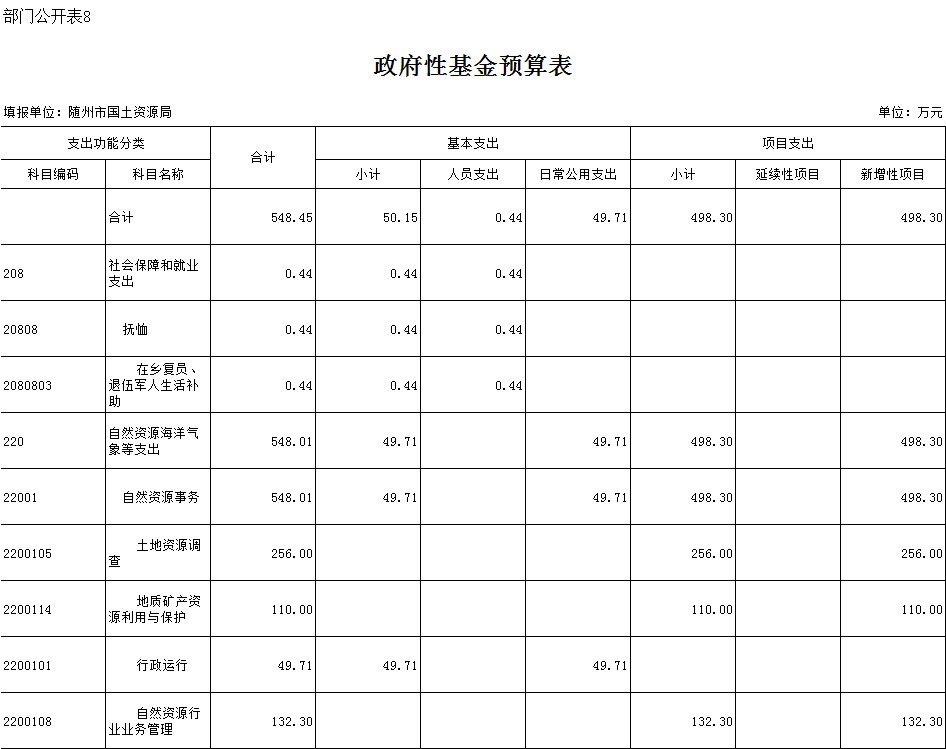 隨州市國土資源局本級2019年度政府性基金預算合計548.45萬元,比上年度預算總額安排746.73萬元減少198.28萬元,減少比例26.55%。主要原因是2018年度結轉結余資金342.98萬元待支付,2019年度減少了政府性基金預算。