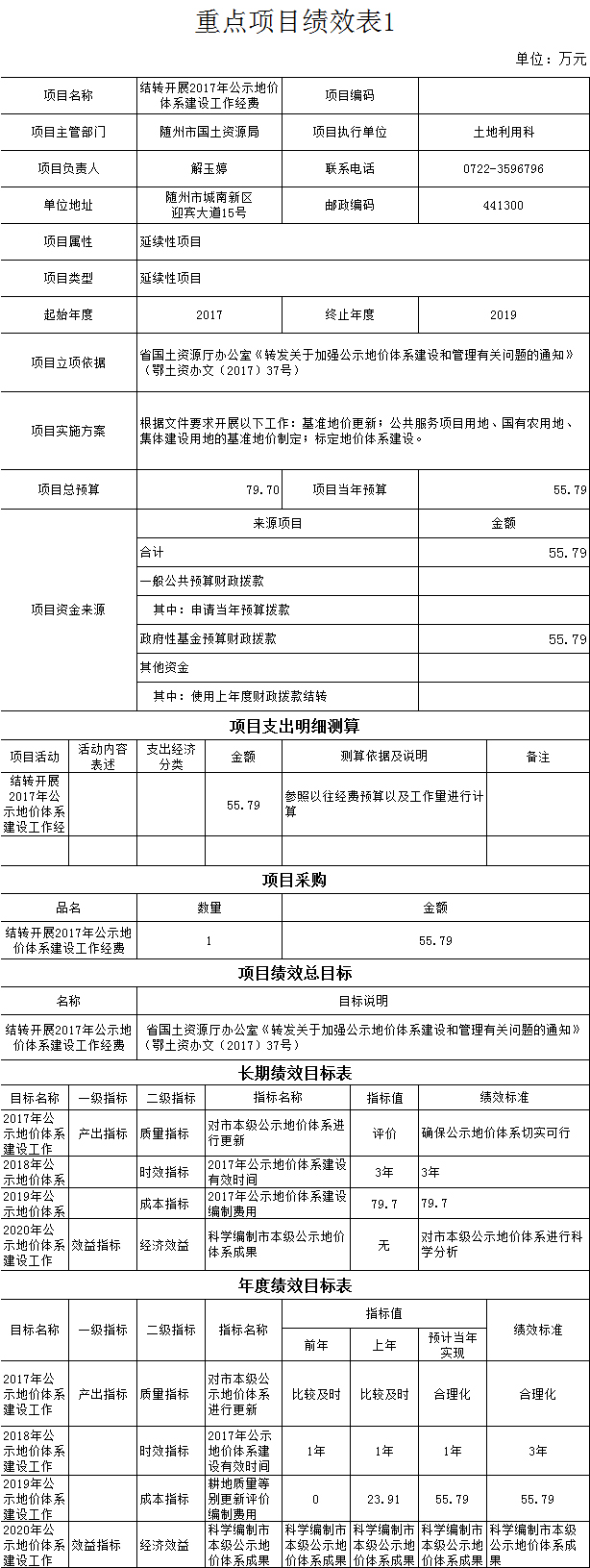 ??? 2、項目支出包括隨州市第三次土地調查、全市地質災害防治、隨州市曾都隨縣廣水地質災害詳細調查、隨州市本級2019年國有建設用地計劃編制、2017年公示地價體系建設、國土資源執法巡查快速反應體系指揮中心建設、隨州市征地補償標準調整等國土資源業務管理支出,主要用于保障全市各項國土業務的更好開展。