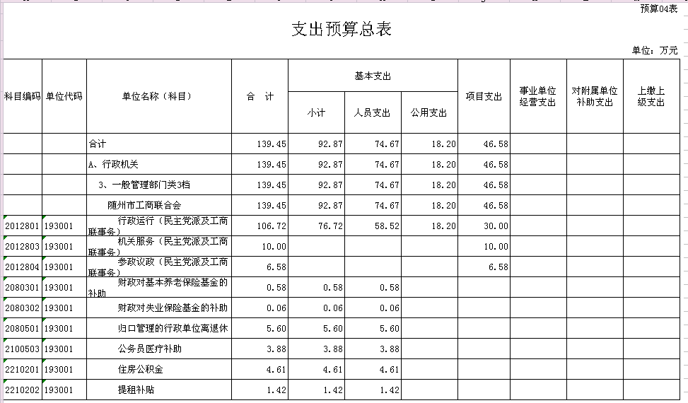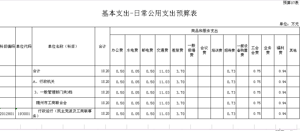 | 193001 | ????隨州市工商聯合會 | 21.76 | 11.76 | 0.73 | 0.73 | 10.00 | 11.03 | 11.03 | 11.03 | 11.03 | |||