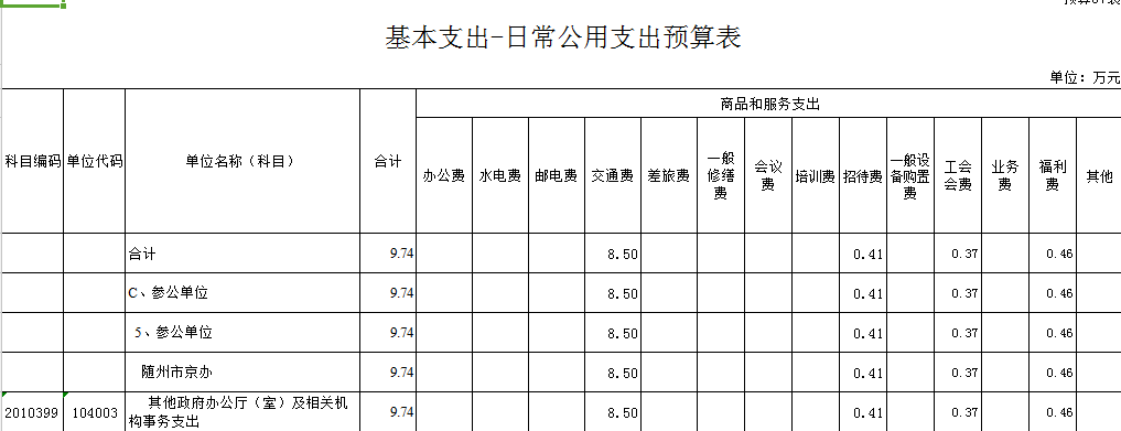 | 單位編碼 | 單位名稱 | 三公總計(jì) | 其中:財(cái)撥 | 公務(wù)接待費(fèi) | 因公出國(境)費(fèi) | 公務(wù)用車 | |||||||